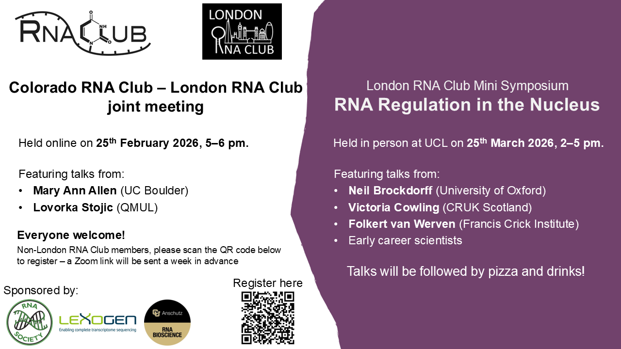 The London RNA Club is a community of scientists passionate about RNA Biology. RNA has a complex role as a carrier of genetic information, partner in metabolic processes and master regulator of cell function and differentiation. To understand the RNA world and its role in disease, we discuss ongoing work, promote collaborations and initiatives, and share technical expertise. We hold meetings in an variety of formats, in person and online, and we welcome all interested scientists.